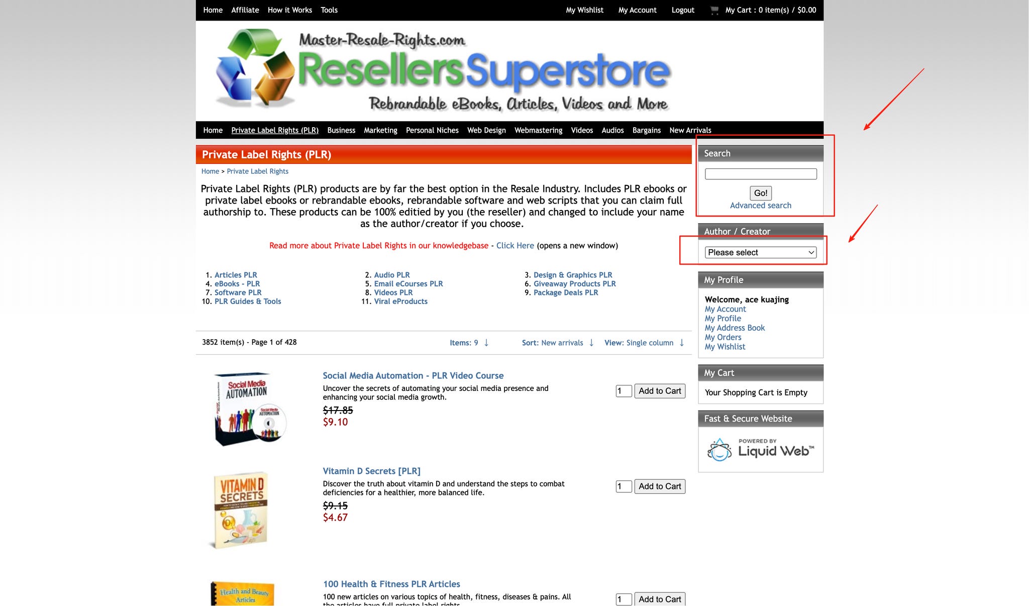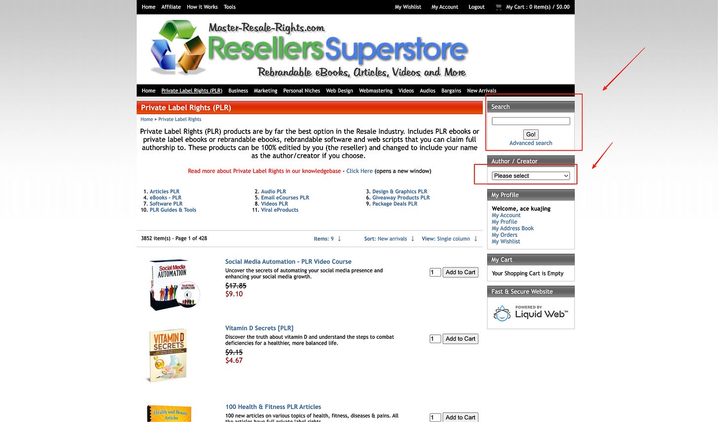 Master-Resale-Rights强调 eBooks、videos、articles 数量巨大,并提供搜索与作者筛选。