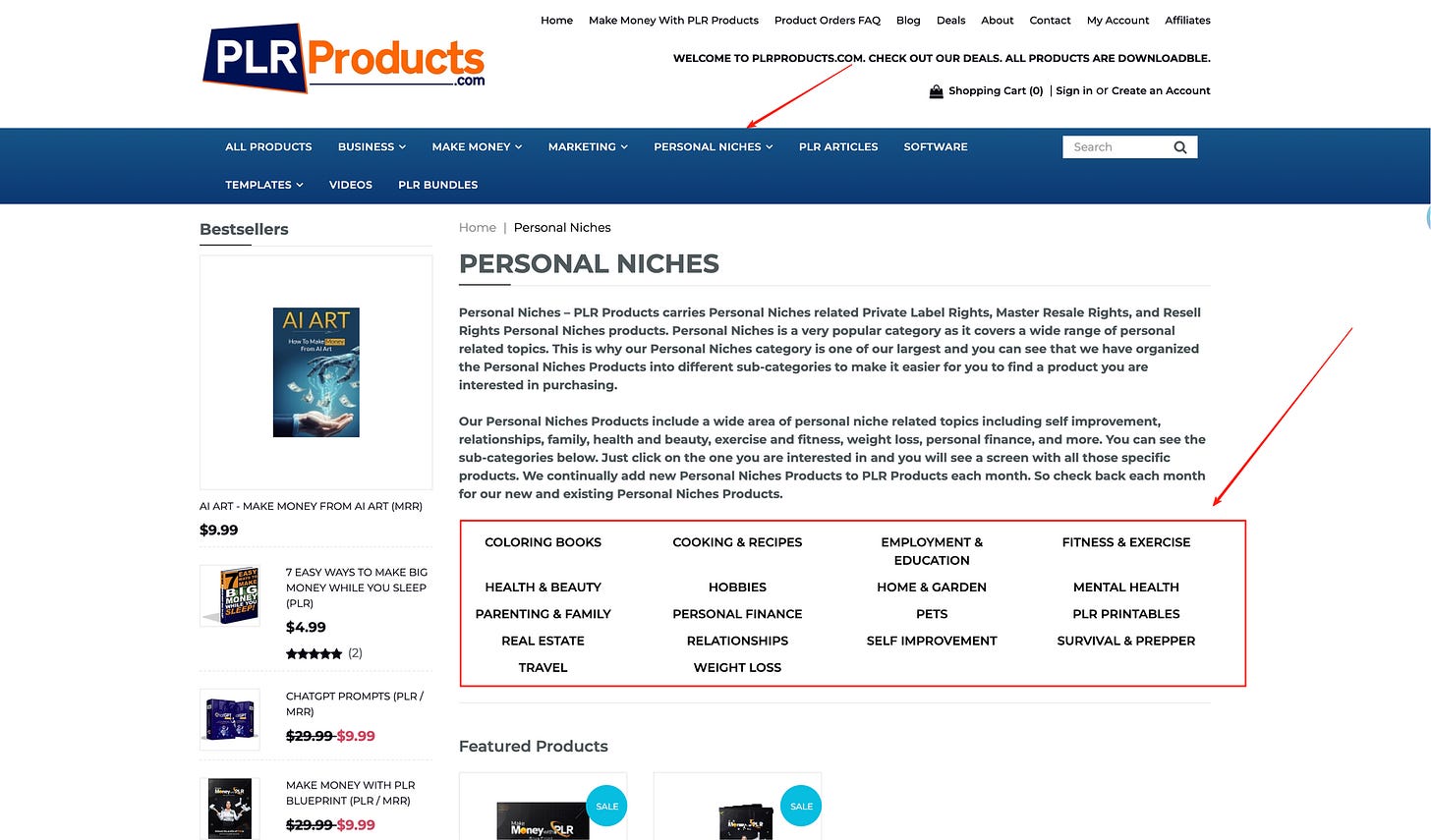 BuyQualityPLR更像一个 PLR 单品电商 + 大量细分类目录,按“交付形态”拆得很细:文章、长文、邮件序列、checklist、lead magnet、printables、销售漏斗、coaching course 等。