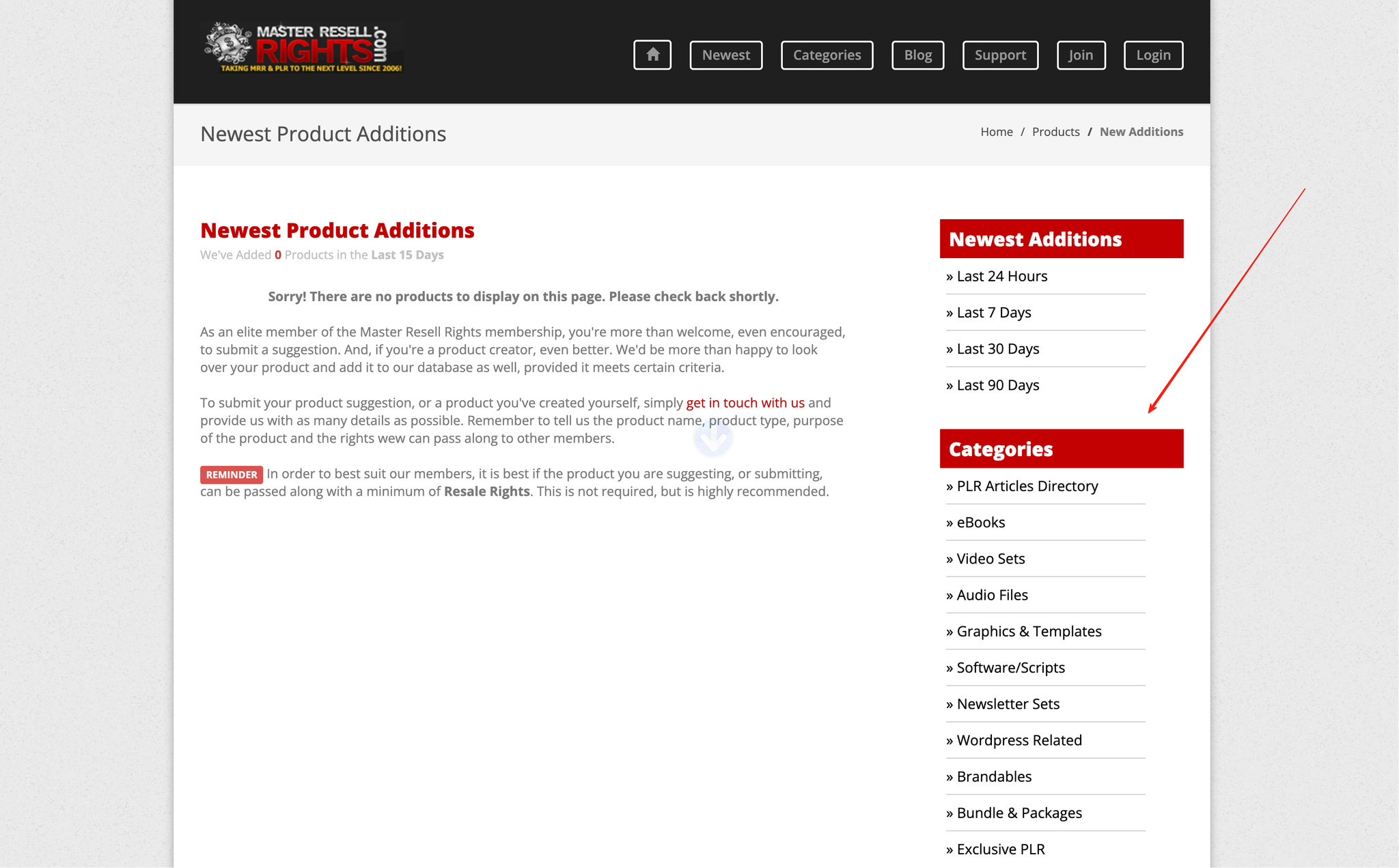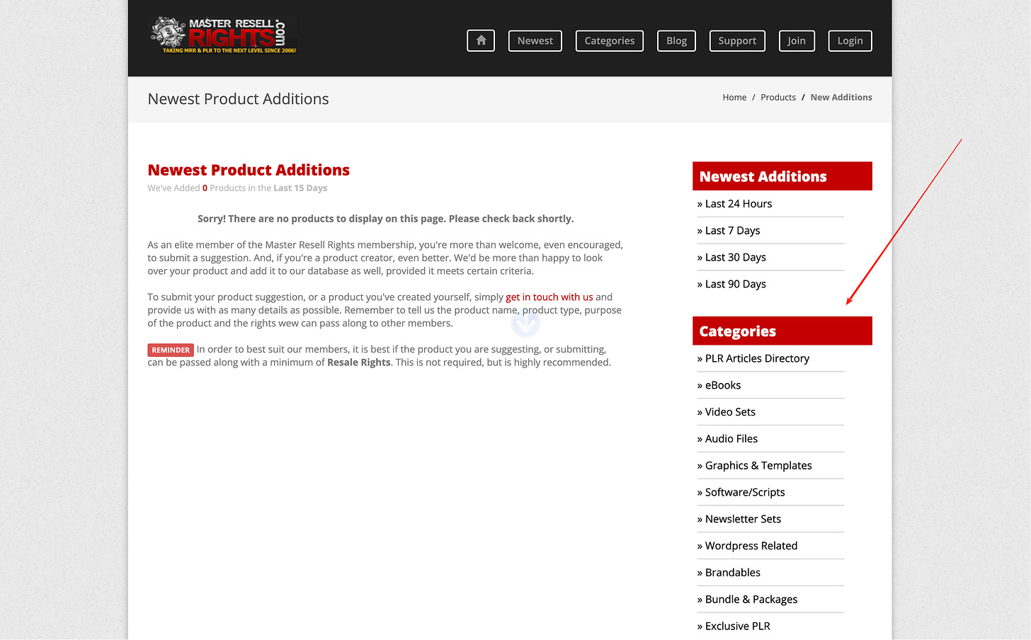 首页直接展示近期新增条目,并带发布日期与 license 类型(MRR/RR/PLR/Personal Use),你能先筛。