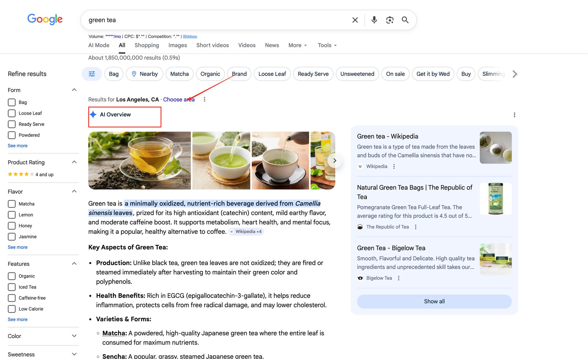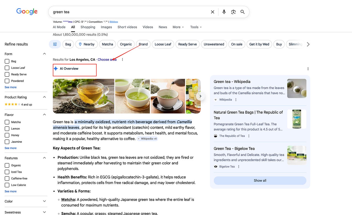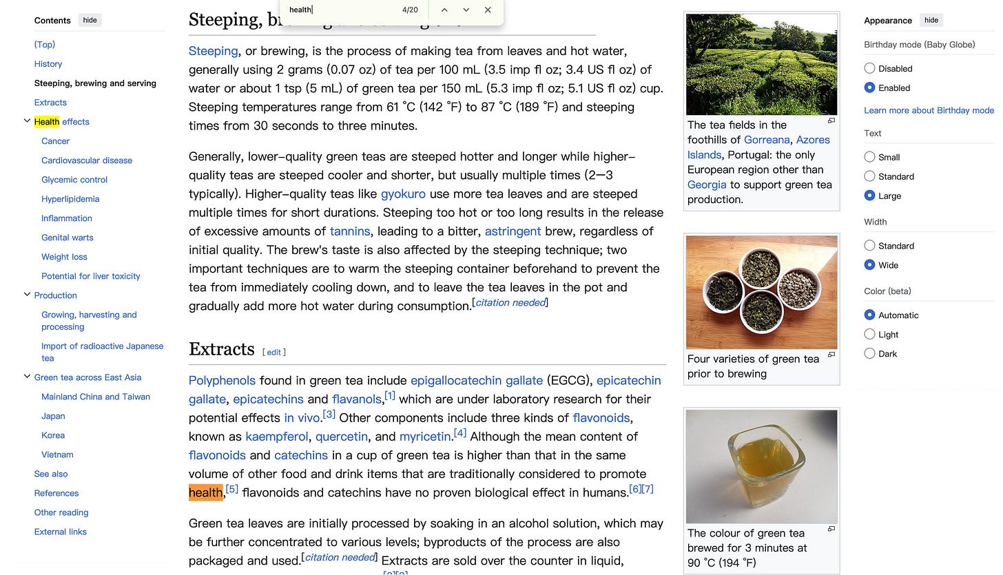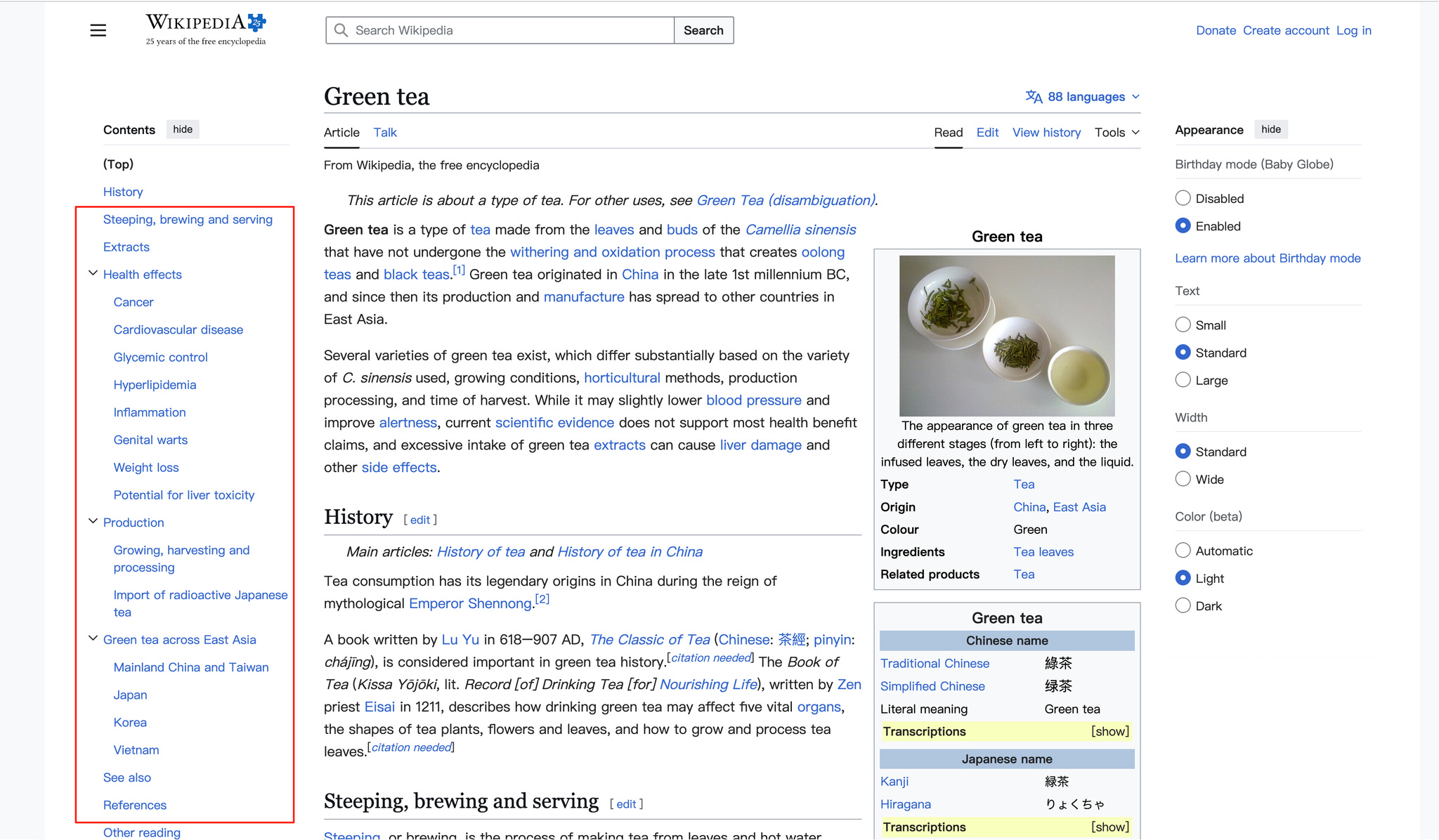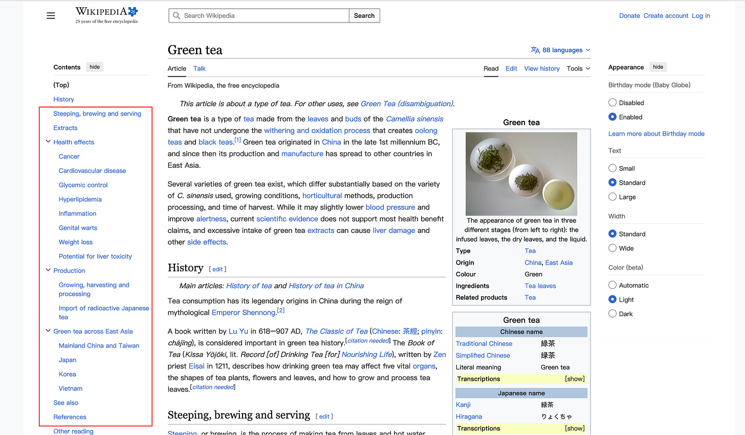 打开Wikipedia,输入green tea关键词,看截图红色方框,从目录结构获取支持主题