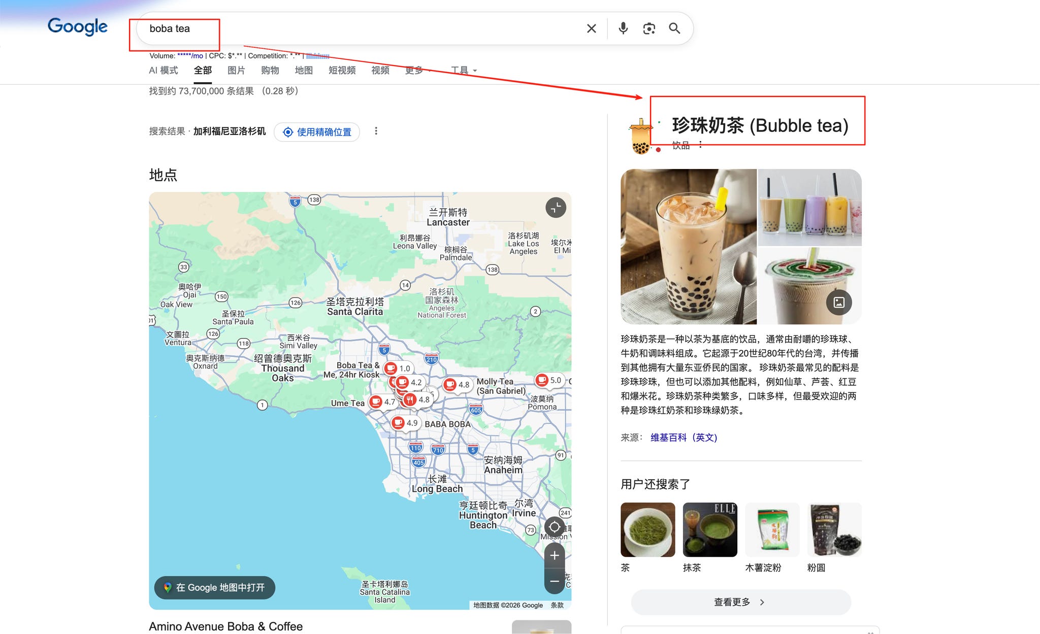 2.1 Google 搜索:看搜索框自动补全;相关搜索(People also search for);相关问题(People Also Ask);知识面板等