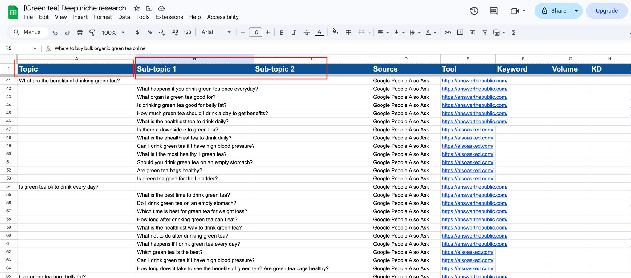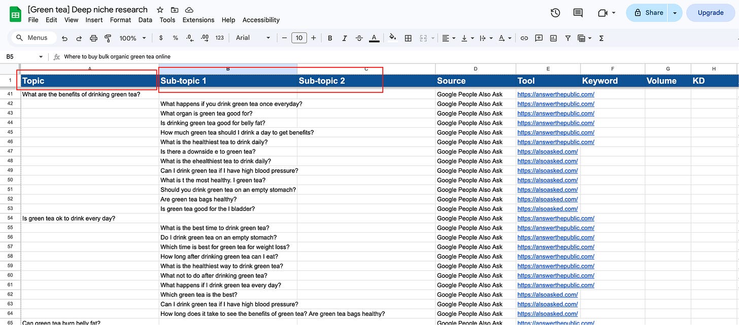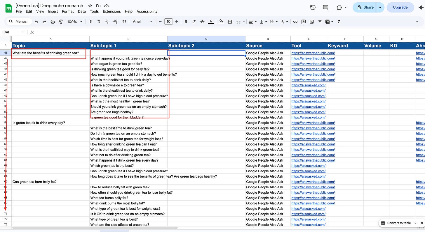 sub-topics:该方向下的具体问题/角度(通常来自 谷歌的People Also Ask、谷歌搜索框自动补全)