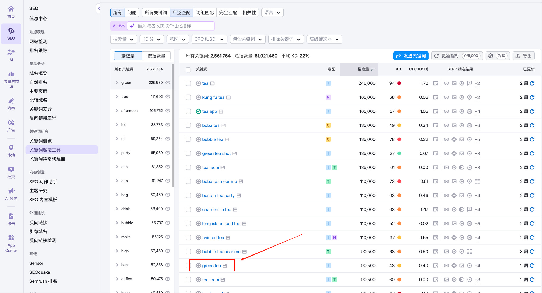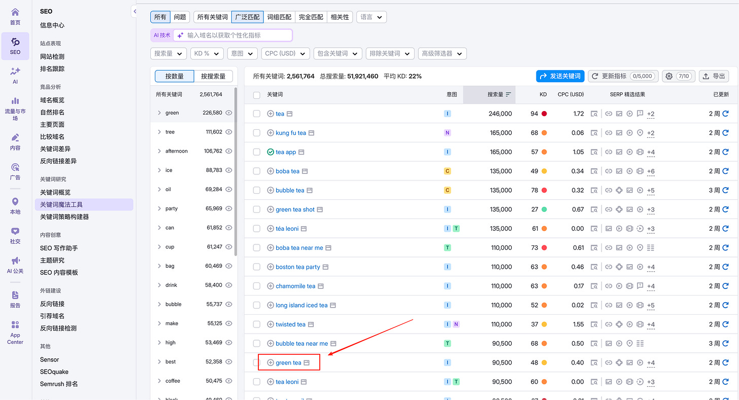 比如我要做个茶叶网站,在Semrush输入tea,茶叶这个关键词