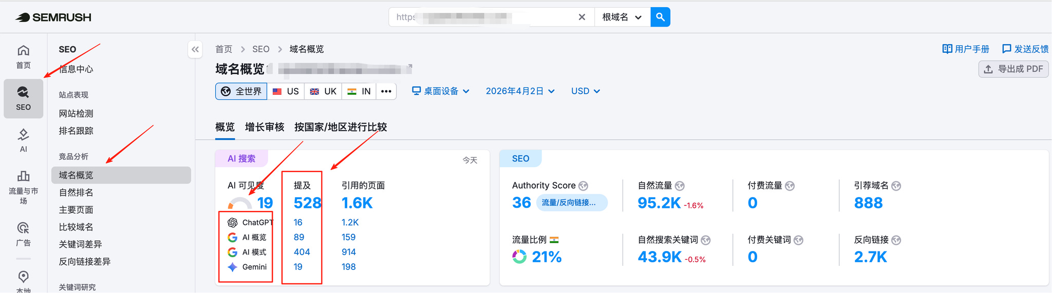 可以用Semrush工具查看,点击这几个地方,查看被各种AI提及,引用