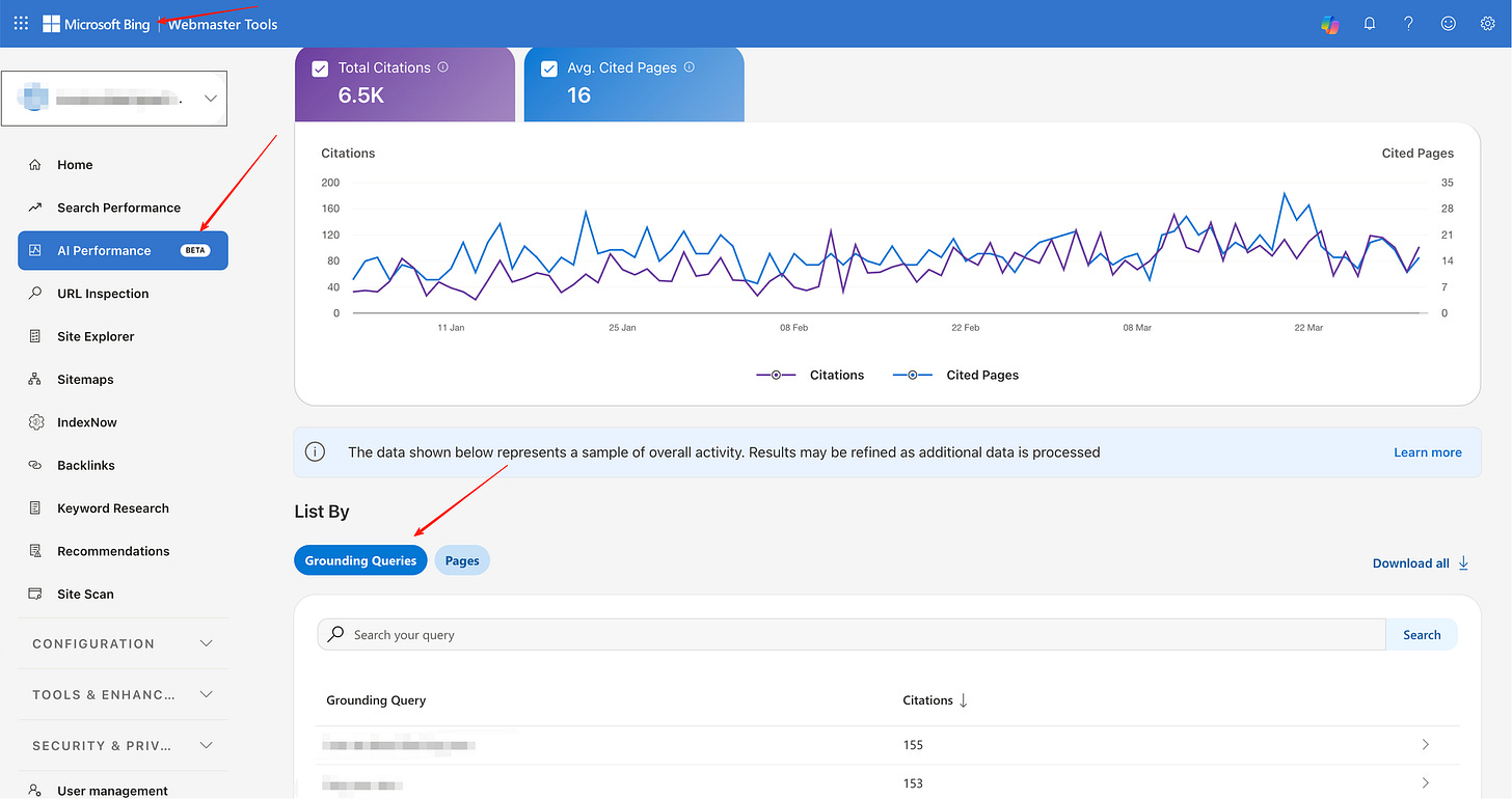 可以用Bing站长工具,免费查询AI搜索的关键词,按照如下点击