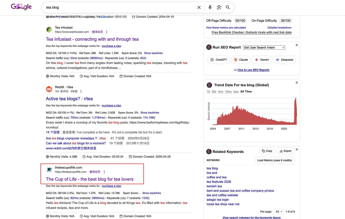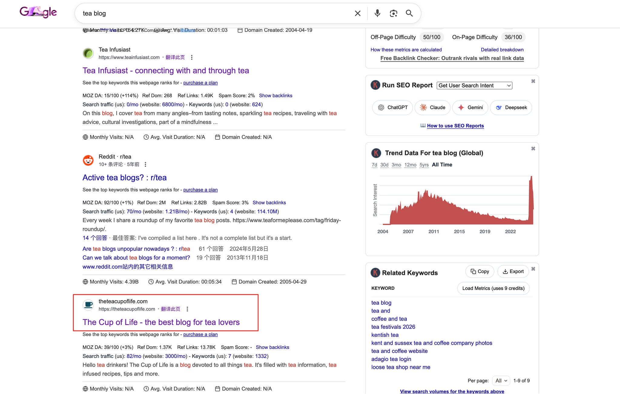 比如打算做个茶叶的利基内容站,在谷歌搜索:tea blog